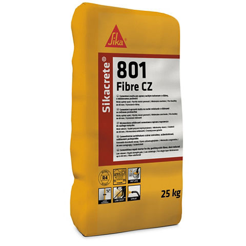 Sikacrete®-801 Fibre CZ je malta s normální dobou zpracování. Splňuje požadavky ČSN EN 1504-3 třídy R4. Díky redukovanému smrštění je vhodná pro větší vrstvy a celoplošné reprofilace metodou suchého stříkání. Při jejím zpracování vzniká méně volně polétavého prachu.