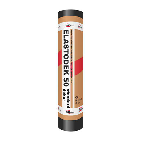 Modifikovaný asfaltový pás s polyesterovou nosnou vložkou, na horním povrchu pokrytý hrubozrnným posypem a spalitelnou PP folií o šířce 9 cm, na spodním povrchu opatřen spalitelnou fólií.