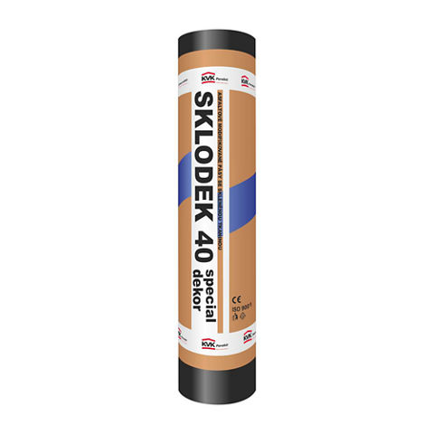SKLODEK 40 SPECIAL DEKOR je modifikovaný asfaltový pás s nosnou vložkou ze skelné tkaniny, na horním povrchu pokrytý hrubozrnným posypem a spalitelnou PP folií o šířce 9 cm, na spodním povrchu opatřen spalitelnou fólií.